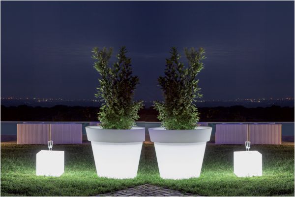 Wenn Größe einen Maßstab hat dann mit dem 1,10 Meter im Radius einen der größten beleuchteten Blumenkübel oder auch Blumentopf genannten Hingucker. Seine Welt spielt sich wohl am Abend ab.
